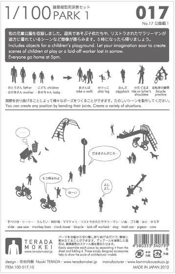 Includes objects for a children's playground. Let your imagination soar to create scenes of children at play or a laid-off worker lost in sorrow. Everyone go home at 5pm. The simple modeling which omits fine details is highly versatile and accentuates the sense of scale.